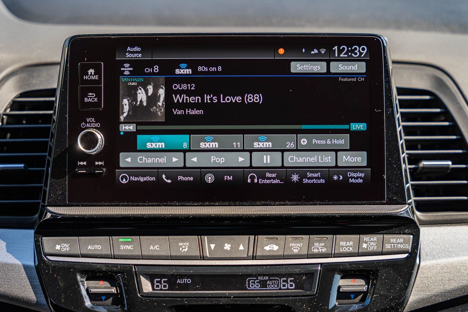 - Radio: 160-Watt AM/FM/HD/SiriusXM Audio System -inc: 7 speakers including subwoofer, 9" color touchscreen display, 7" TFT Meter, Bluetooth® HandsFreeLink, Bluetooth® streaming audio, HondaLink, HondaLink subscription services, Speed-Sensitive Volume Compensation (SVC), Radio Data System (RDS), wireless Apple CarPlay compatibility, wireless Android Auto compatibility, Wi-Fi Hotspot capability, 2.5-amp USB smartphone/audio interface, CabinTalk in-car PA system, advanced rear entertainment system w/12.8" high-resolution screen, HDMI interface w/USB-A, headphone jack (3rd row), Honda Satellite-Linked Navigation System w/voice recognition and Honda HD digital traffic, CabinWatch rear seat monitor, illuminated steering wheel-mounted controls and fin-type roof-mounted antenna, All SiriusXM services require a subscription, sold separately by SiriusXM after the trial period, If you decide to continue service, the plan you choose will automatically renew at the then-current rates, Fees and taxes apply, See the SiriusXM customer agreement and privacy policy at www.siriusxm.com for full terms and how to cancel, which includes calling 1-866-635-2349, Available in the 48 contiguous U.S, and D.C, Some services and features are subject to device capabilities and location restrictions, All fees, content and features are subject to change, SiriusXM, Pandora and all related logos are trademarks of Sirius XM Radio Inc, and its respective subsidiaries
