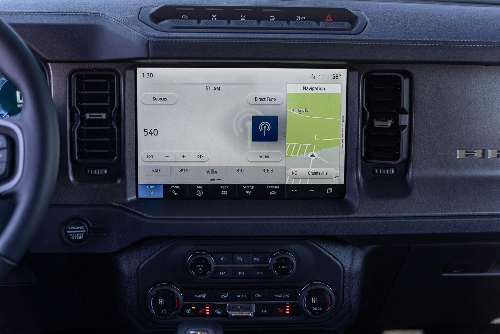 This vehicle comes equipped with Equipment Group 334A Lux Package (2-Door Intelligent Access w/Lock/Unlock, 360-Degree Camera, Adaptive Cruise Control, Ambient Footwell Lighting, Connected Navigation, Dr & Pass Illuminated Sliding Visor Vanity Mirrors, Dual Smart Charging USB Ports, Dual-Zone Electronic Automatic Temperature Control, Evasive Steering Assist, Front Parking Sensors, Front Row Heated Seats, Information on Demand Panel, Power Outlet - Back Side of Center Floor Console, Radio: B&O Sound System by Bang & Olufsen, Rear Parking Sensors, Sideview Mirrors, and Universal Garage Door Opener), 4-Wheel Disc Brakes, 4.7 Axle Ratio, 7 Speakers, ABS brakes, Air Conditioning, Alloy wheels, AM/FM radio: SiriusXM with 360L, AM/FM Stereo, Auto High-Beam Headlamps, Auto High-beam Headlights, Auto-dimming Rear-View mirror, BLIS Blind Spot Information System, Brake assist, Compass, Delay-off headlights, Driver door bin, Driver vanity mirror, Dual front impact airbags, Dual front side impact airbags, Electronic Stability Control, Emergency communication system: 911 Assist, Exterior Parking Camera Rear, Front anti-roll bar, Front Bucket Seats, Front Center Armrest, Front fog lights, Front License Plate Bracket, Front reading lights, Front wheel independent suspension, Fully automatic headlights, Hard Top Sound Deadening Headliner, Heated door mirrors, Heated front seats, Heated steering wheel, Illuminated entry, Integrated roll-over protection, Internet access capable: FordPass Connect, Lane-Keeping System, Leather Shift Knob, Low tire pressure warning, Marine Grade Vinyl Heated Bucket Seats, Occupant sensing airbag, Outside temperature display, Overhead airbag, Overhead console, Panic alarm, Passenger door bin, Passenger vanity mirror, Power door mirrors, Power steering, Power windows, Pre-Collision Assist w/Automatic Emergency Braking, Radio data system, Rear-View Camera, Rear-Window Defroster & Washer, Remote keyless entry, Security system, Shadow Black Painted Hard Top, SiriusXM w/360L, Speed control, Split folding rear seat, Steering wheel mounted audio controls, SYNC 4, Tachometer, Telescoping steering wheel, Tilt steering wheel, Traction control, Trip computer, Variably intermittent wipers, Voltmeter, and Wheels: 17 Carbonized Gray-Painted Aluminum.