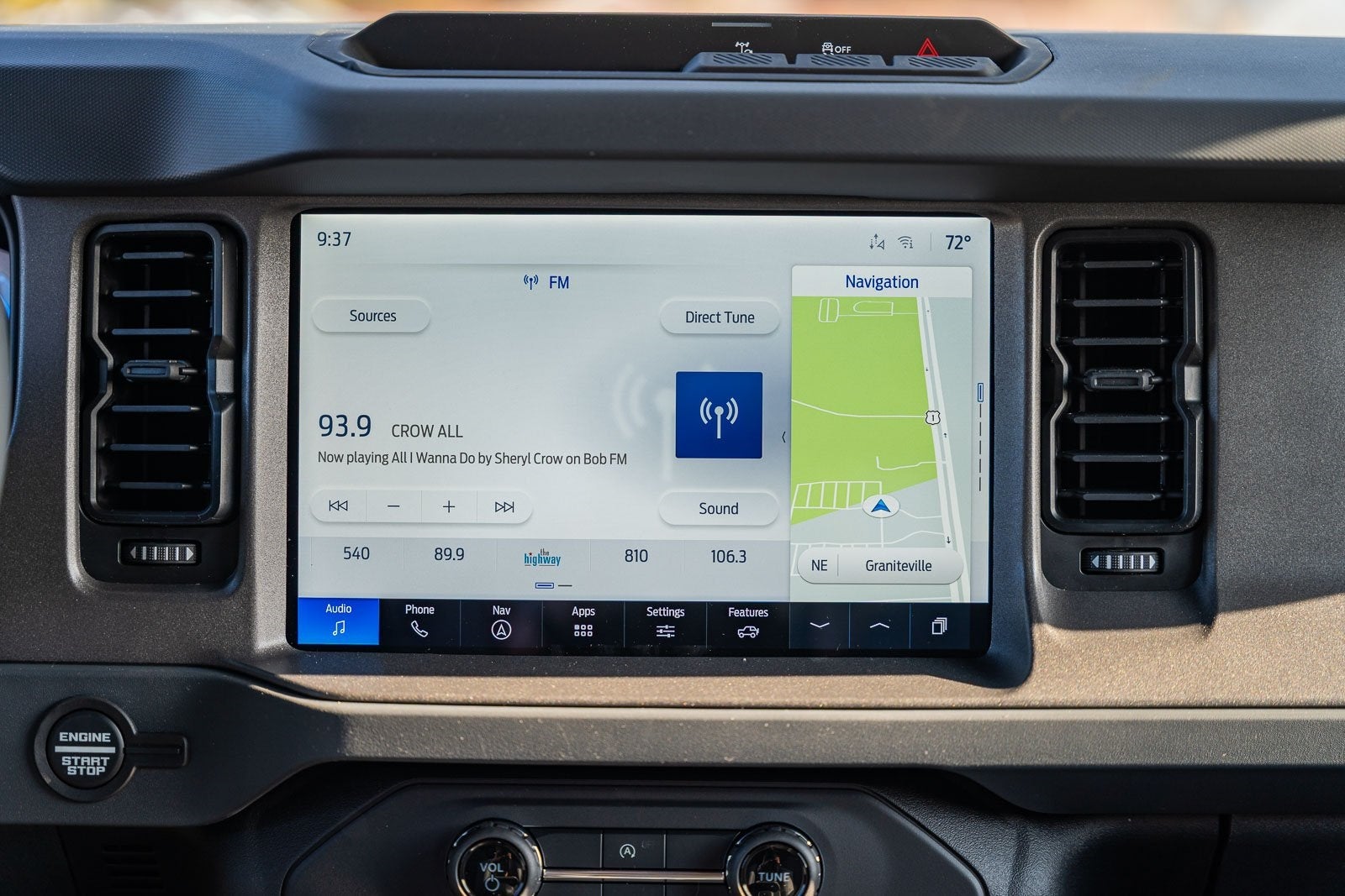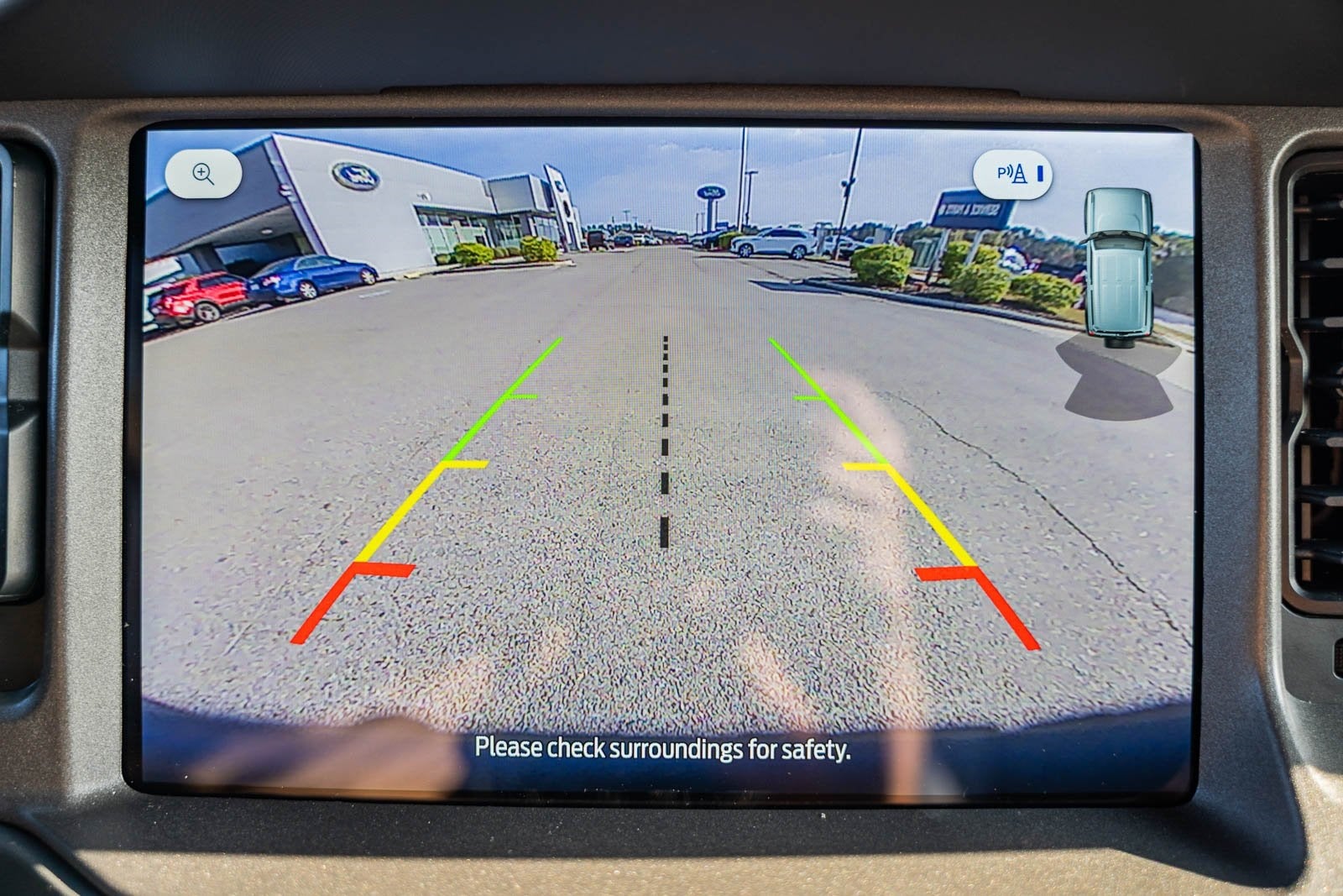 This vehicle comes equipped with Equipment Group 222A Mid Package (2-Door Intelligent Access w/Lock/Unlock, Ambient Footwell Lighting, Connected Navigation, Dr & Pass Illuminated Sliding Visor Vanity Mirrors, Dual Smart Charging USB Ports, Dual-Zone Electronic Automatic Temperature Control, Front Row Heated Seats, Power Outlet - Back Side of Center Floor Console, and Rear Parking Sensors), 4-Wheel Disc Brakes, 4.46 Axle Ratio, 7 Speakers, ABS brakes, Air Conditioning, Alloy wheels, AM/FM radio: SiriusXM with 360L, AM/FM Stereo, Auto High-Beam Headlamps, Auto High-beam Headlights, BLIS Blind Spot Information System, Brake assist, Carbonized Gray Molded-In-Color Hard Top, Cloth Bucket Seats, Compass, Delay-off headlights, Driver door bin, Driver vanity mirror, Dual front impact airbags, Dual front side impact airbags, Electronic Stability Control, Emergency communication system: 911 Assist, Exterior Parking Camera Rear, Front anti-roll bar, Front Bucket Seats, Front Center Armrest, Front License Plate Bracket, Front reading lights, Front wheel independent suspension, Fully automatic headlights, Hard Top Sound Deadening Headliner, Heated door mirrors, Illuminated entry, Integrated roll-over protection, Internet access capable: FordPass Connect, Lane-Keeping System, Leather Shift Knob, Low tire pressure warning, Occupant sensing airbag, Outside temperature display, Overhead airbag, Overhead console, Panic alarm, Passenger door bin, Passenger vanity mirror, Power door mirrors, Power steering, Power windows, Pre-Collision Assist w/Automatic Emergency Braking, Radio data system, Rear-View Camera, Rear-Window Defroster & Washer, Remote keyless entry, Security system, SiriusXM w/360L, Speed control, Split folding rear seat, Steering wheel mounted audio controls, SYNC 4, Tachometer, Telescoping steering wheel, Tilt steering wheel, Traction control, Trip computer, Variably intermittent wipers, and Wheels: 17 Carbonized Gray-Painted Aluminum.