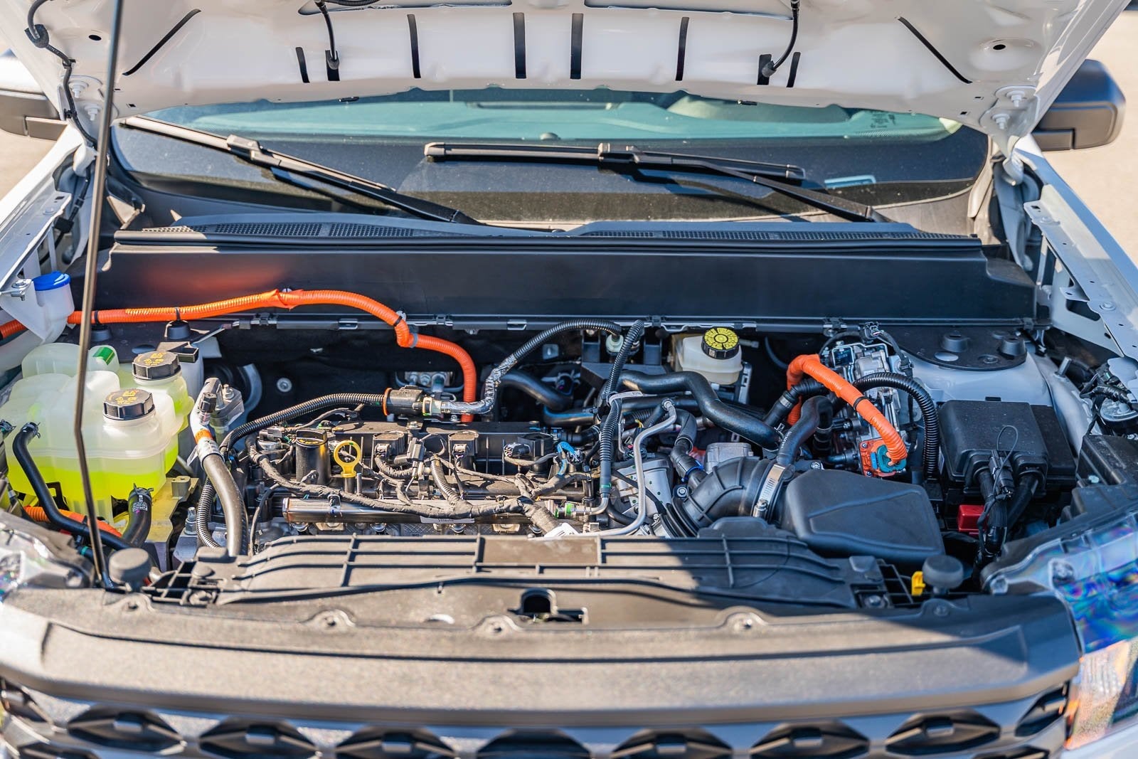 This vehicle comes equipped with 2.5L I-4 Hybrid, 2.91 Axle Ratio, 4-Wheel Disc Brakes, 6 Speakers, ABS brakes, Air Conditioning, AM/FM radio: SiriusXM with 360L, Apple CarPlay/Android Auto, Auto High Beams, Auto High-beam Headlights, Automatic temperature control, Brake assist, Bumpers: body-color, Compass, Delay-off headlights, Driver door bin, Driver vanity mirror, Dual front impact airbags, Dual front side impact airbags, Electronic Stability Control, Emergency communication system: SYNC 4 911 Assist, Exterior Parking Camera Rear, Front anti-roll bar, Front Bucket Seats, Front Center Armrest, Front Cloth Bucket Seats, Front reading lights, Front wheel independent suspension, Fully automatic headlights, Illuminated entry, Knee airbag, Low tire pressure warning, Occupant sensing airbag, Outside temperature display, Overhead airbag, Overhead console, Panic alarm, Passenger door bin, Passenger vanity mirror, Power steering, Power windows, Pre-Collision Assist w/Automatic Emergency Braking, Radio data system, Radio: AM/FM Stereo w/6 Speakers, Rear anti-roll bar, Rear step bumper, Rear-View Camera, Remote keyless entry, SiriusXM w/360L, Speed control, Speed-sensing steering, Steering wheel mounted audio controls, SYNC 4 w/Enhanced Voice Recognition, Telescoping steering wheel, Tilt steering wheel, Traction control, Trip computer, and Wheels: 17 Steel w/Sparkle Silver Painted Cover.