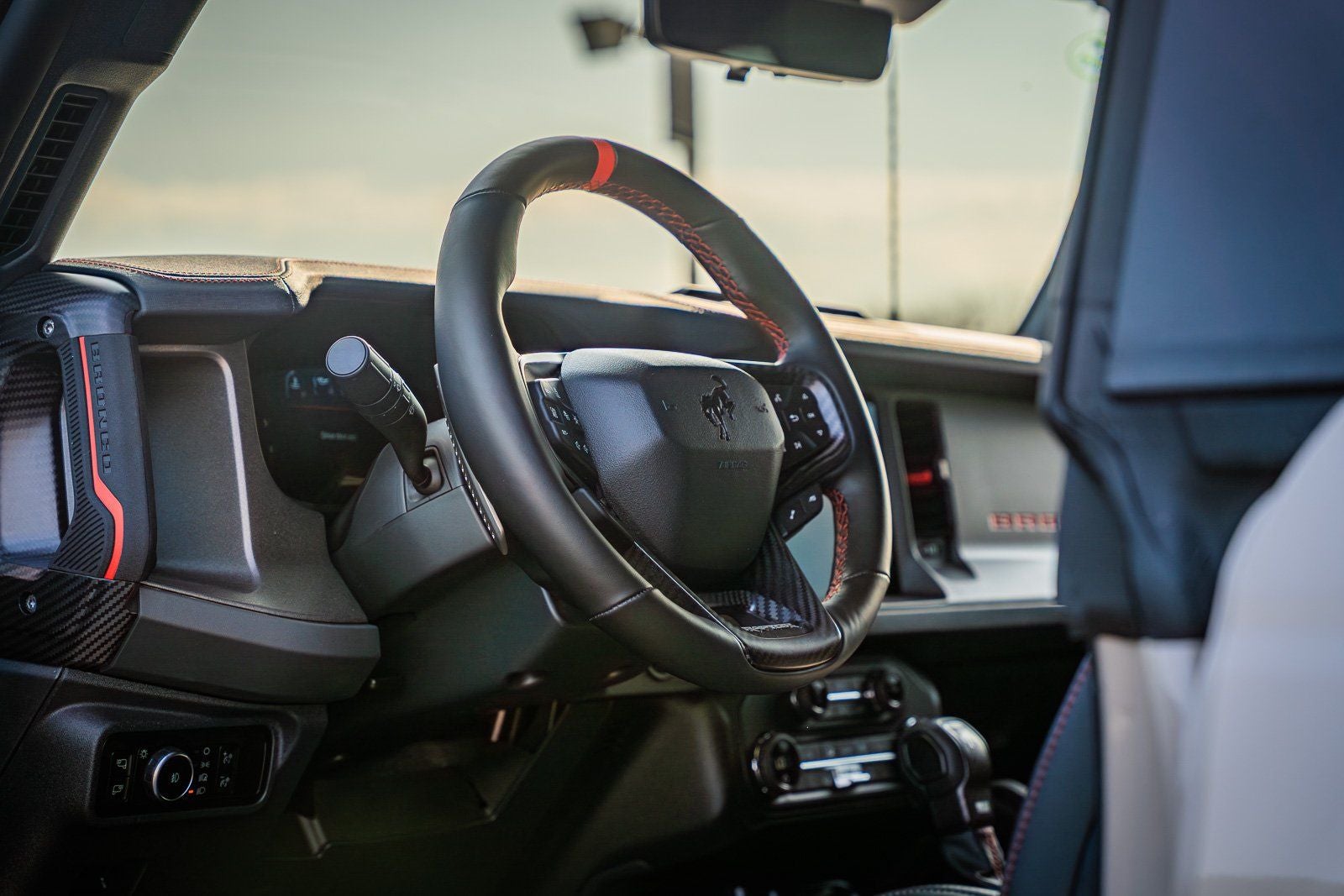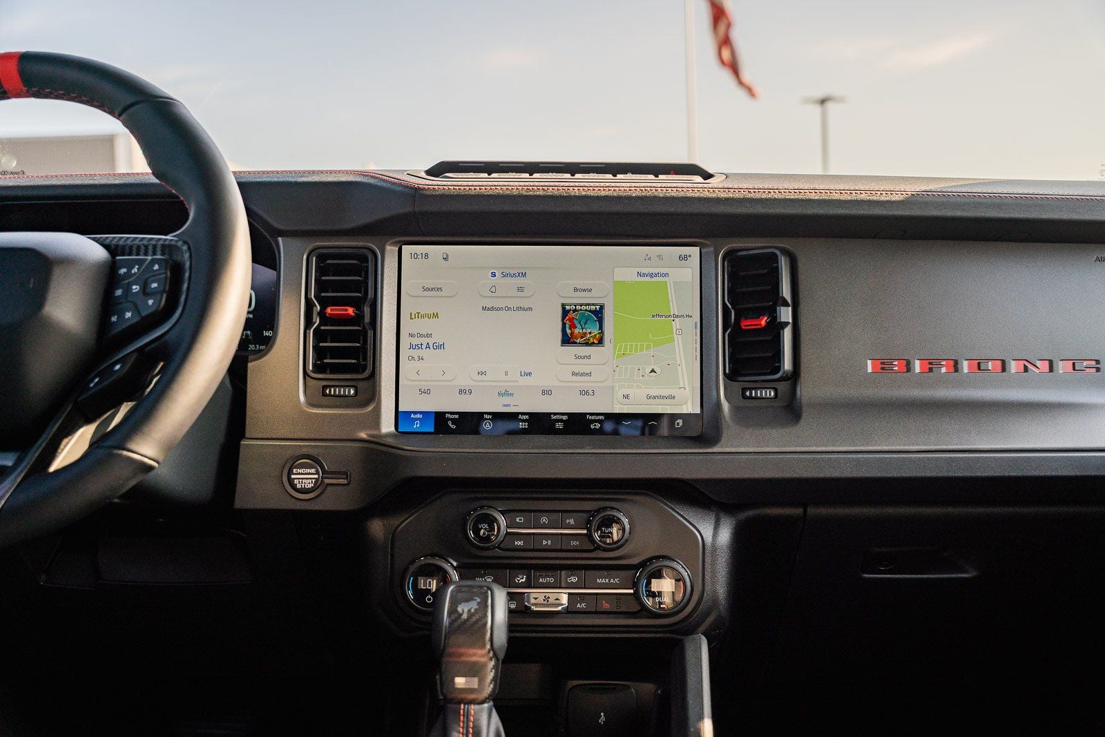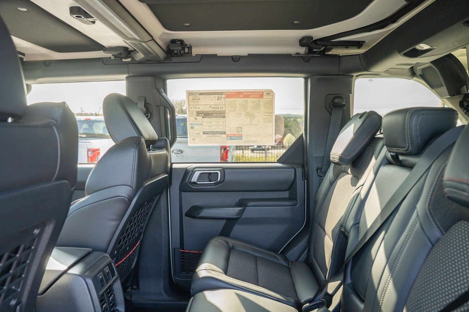 This vehicle comes equipped with Equipment Group 374A Lux Package (Marine Grade Vinyl Bucket Seats and Wheels: 17 Black High Gloss-Painted Aluminum), Ford Connectivity Package (1-Year Included), 12 Speakers, 4-Wheel Disc Brakes, ABS brakes, Air Conditioning, Alloy wheels, AM/FM radio: SiriusXM with 360L, Auto High-beam Headlights, Auto-dimming Rear-View mirror, Automatic temperature control, Brake assist, Compass, Connected Navigation, Convertible HardTop, Convertible roof lining, Delay-off headlights, Driver door bin, Driver vanity mirror, Dual front impact airbags, Dual front side impact airbags, Electronic Stability Control, Emergency communication system: 911 Assist, Exterior Parking Camera Rear, Front anti-roll bar, Front Bucket Seats, Front Center Armrest, Front dual zone A/C, Front fog lights, Front License Plate Bracket, Front reading lights, Front wheel independent suspension, Fully automatic headlights, Glass rear window, Hard Top Sound Deadening Headliner, Heated door mirrors, Heated front seats, Heated steering wheel, Illuminated entry, Integrated roll-over protection, Interior Carbon Fiber Pack, Leather Shift Knob, Low tire pressure warning, Navigation system: Connected Navigation, Occupant sensing airbag, Outside temperature display, Overhead airbag, Overhead console, Painted Hard Top, Panic alarm, Passenger door bin, Passenger vanity mirror, Power door mirrors, Power steering, Power windows, Radio data system, Rear anti-roll bar, Rear seat center armrest, Rear window defroster, Rear window wiper, Rear-Window Defroster and Washer, Remote keyless entry, Security system, SiriusXM with 360L, Speed control, Split folding rear seat, Steering wheel mounted audio controls, SYNC 4, Tachometer, Telescoping steering wheel, Tilt steering wheel, Traction control, Trip computer, Turn signal indicator mirrors, Variably intermittent wipers, and Voltmeter.