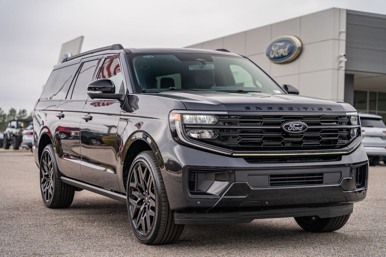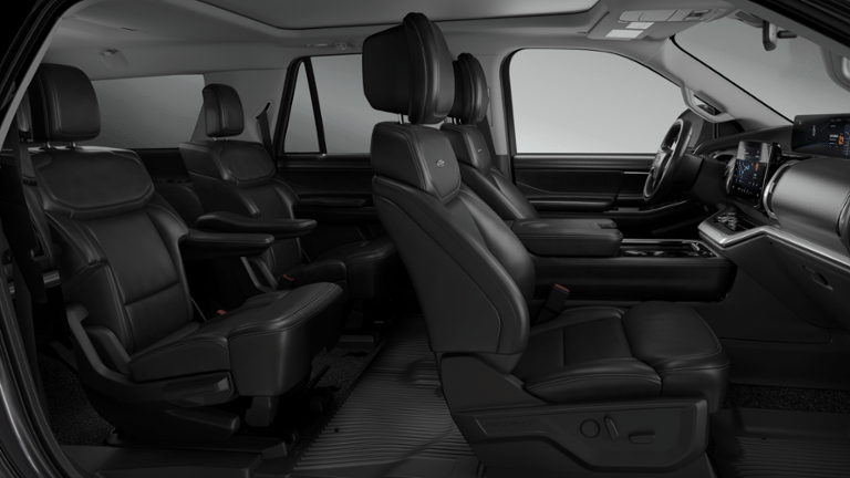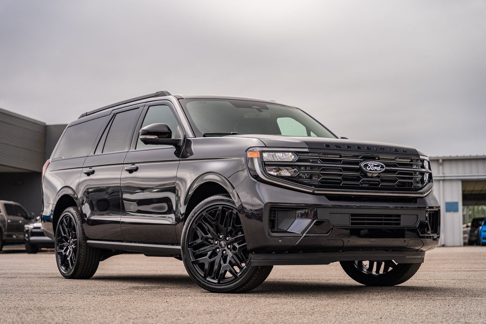 This vehicle comes equipped with Driver's Package (Radio: B&O Play Unleashed and SiriusXM with 360L), Equipment Group 600A Standard Package (2nd Row Power-Folding Captain's Chairs, 3.73 Axle Ratio, BlueCruise Equipped (90-Day Trial), Ford Digital Experience, Heated and Ventilated Leather Front Captain's Chairs, Power Tilt/Telescopic Steering Wheel with Memory, Radio: B&O Sound System by Bang and Olufsen, and Wheels: 20 x 8.5 Ebony Bright Machined Aluminum), Ford Connectivity Package (1-Year Included), Stealth Appearance Package (Black Belt Molding, Black Expedition Lettering on Hood, Black Headlamp Bezel with Ebony Trim Applique, Black Platinum Badge on Tailgate, Black Roof Rails, Carbon Black Front Bumper/Fascia, Rear Side Windows Laminated Glass, and Signature Grille Lighting), Stealth Performance Package (Black Onyx Painted Power Deployable Running Boards, Engine Sound Enhancer, High Flow Exhaust System, and Wheels: 24 x 9.5 Ebony Painted Aluminum), 10 Speakers, 3rd row seats: split-bench, 4-Wheel Disc Brakes, ABS brakes, Air Conditioning, Alloy wheels, AM/FM radio: SiriusXM with 360L, Apple CarPlay/Android Auto, Auto High-beam Headlights, Auto-dimming door mirrors, Auto-dimming Rear-View mirror, Automatic temperature control, BlueCruise (equipment + 1-Year + 90-Day Plan), Brake assist, Bumpers: body-color, Compass, Delay-off headlights, Driver door bin, Driver vanity mirror, Dual front impact airbags, Dual front side impact airbags, Electronic Stability Control, Emergency communication system: 911 Assist, Exterior Parking Camera Rear, Four wheel independent suspension, Front and 2nd Rows Floor Liners (tray Style), Front anti-roll bar, Front Bucket Seats, Front Center Armrest, Front dual zone A/C, Front License Plate Bracket, Front reading lights, Fully automatic headlights, Garage door transmitter, Genuine wood dashboard insert, Genuine wood door panel insert, Heated door mirrors, Heated front seats, Heated rear seats, Heated steering wheel, Illuminated entry, Intersection Assist, Leather steering wheel, Low tire pressure warning, Memory seat, Navigation System, Occupant sensing airbag, Outside temperature display, Overhead airbag, Overhead console, Panic alarm, Passenger door bin, Passenger vanity mirror, Power door mirrors, Power driver seat, Power moonroof: Vista Roof, Power passenger seat, Power steering, Power windows, Radio data system, Rain sensing wipers, Rear air conditioning, Rear anti-roll bar, Rear reading lights, Rear window defroster, Rear window wiper, Reclining 3rd row seat, Remote keyless entry, Security system, Speed control, Speed-sensing steering, Speed-Sensitive Wipers, Split folding rear seat, Spoiler, Steering wheel memory, Steering wheel mounted audio controls, Tachometer, Telescoping steering wheel, Tilt steering wheel, Traction control, Trip computer, Turn signal indicator mirrors, Variably intermittent wipers, Ventilated front seats, Voltmeter, and Wheels: 22 x 9.0 Ebony Bright Machined Face Aluminum.
