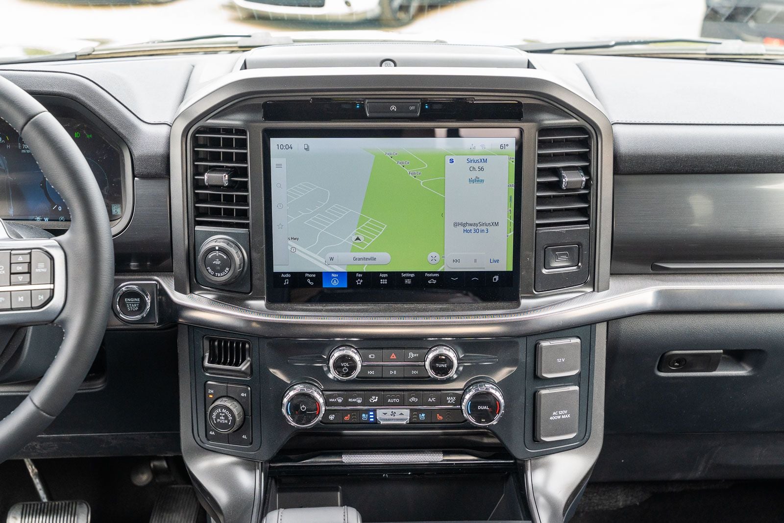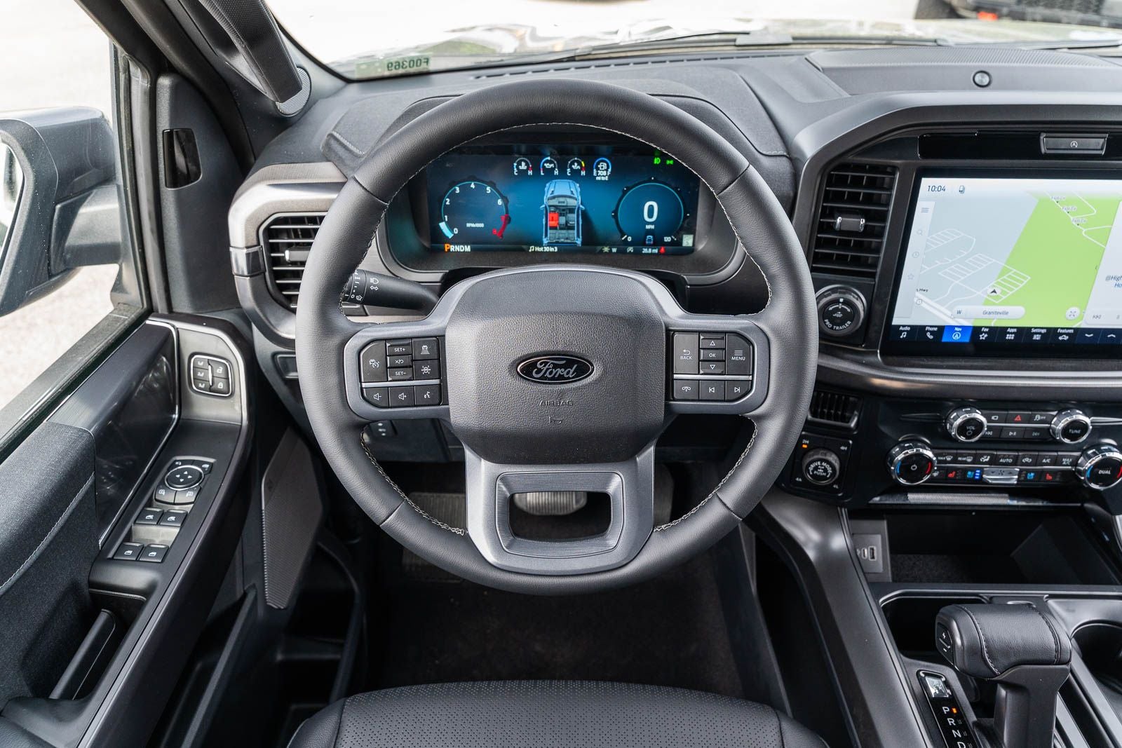 This vehicle comes equipped with Ford Connectivity Package (1-Year Included), Internet access capable: 5G Modem - Ford Connectivity Package, 4WD, 3.31 Axle Ratio, 4-Wheel Disc Brakes, 8 Speakers, ABS brakes, Air Conditioning, Alloy wheels, AM/FM radio: SiriusXM with 360L, Auto High-beam Headlights, Auto-dimming door mirrors, Auto-dimming Rear-View mirror, Automatic temperature control, Brake assist, Bumpers: chrome, Chrome wheels, Compass, Delay-off headlights, Driver door bin, Driver vanity mirror, Dual front impact airbags, Dual front side impact airbags, Electronic Stability Control, Emergency communication system: SYNC 4 911 Assist, Front anti-roll bar, Front Bucket Seats, Front Center Armrest, Front dual zone A/C, Front fog lights, Front reading lights, Front wheel independent suspension, Fully automatic headlights, Garage door transmitter, Heated door mirrors, Heated front seats, Heated steering wheel, Illuminated entry, Low tire pressure warning, Memory seat, Navigation system: Connected Navigation, Occupant sensing airbag, Outside temperature display, Overhead airbag, Overhead console, Panic alarm, Passenger door bin, Passenger vanity mirror, Power door mirrors, Power driver seat, Power passenger seat, Power steering, Power windows, Radio data system, Radio: B&O Sound System by Bang and Olufsen, Rain sensing wipers, Rear reading lights, Rear seat center armrest, Rear step bumper, Rear window defroster, Remote keyless entry, Security system, Speed control, Split folding rear seat, Steering wheel mounted audio controls, SYNC 4 with Enhanced Voice Recognition, Tachometer, Telescoping steering wheel, Tilt steering wheel, Traction control, Trip computer, Turn signal indicator mirrors, Variably intermittent wipers, Ventilated front seats, and Wheels: 18 Chrome-Like PVD.