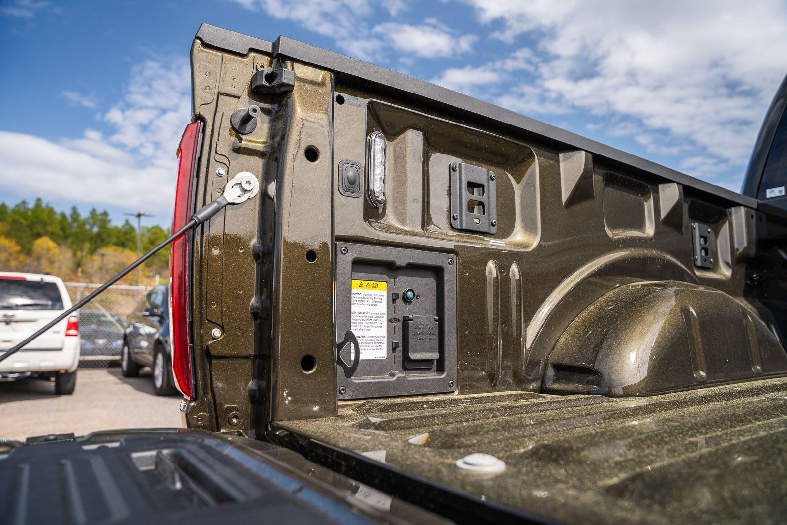 This vehicle comes equipped with Ford Connectivity Package (1-Year Included), Internet access capable: 5G Modem - Ford Connectivity Package, 4WD, 14 Speakers, 17 Cast Aluminum Wheels, 4-Wheel Disc Brakes, ABS brakes, Adjustable pedals, Air Conditioning, Alloy wheels, AM/FM radio: SiriusXM with 360L, Auto High-beam Headlights, Auto tilt-away steering wheel, Auto-dimming door mirrors, Auto-dimming Rear-View mirror, Automatic temperature control, Brake assist, Bumpers: body-color, Compass, Delay-off headlights, Driver door bin, Driver vanity mirror, Dual front impact airbags, Dual front side impact airbags, Electronic Locking with 4.10 Axle Ratio, Electronic Stability Control, Emergency communication system: SYNC 4 911 Assist, Front anti-roll bar, Front Bucket Seats, Front Center Armrest, Front dual zone A/C, Front fog lights, Front reading lights, Front wheel independent suspension, Fully automatic headlights, Garage door transmitter, Heated door mirrors, Heated front seats, Heated rear seats, Heated steering wheel, Illuminated entry, Lane Departure Warning System, Leather steering wheel, Leather Trimmed Seats, Low tire pressure warning, Memory seat, Navigation system: Connected Navigation, Occupant sensing airbag, Outside temperature display, Overhead airbag, Overhead console, Panic alarm, Passenger door bin, Passenger vanity mirror, Pedal memory, Power door mirrors, Power driver seat, Power passenger seat, Power steering, Power windows, Radio data system, Radio: B&O Unleashed Sound System by Bang & Olufsen, Rain sensing wipers, Rear reading lights, Rear step bumper, Rear window defroster, Remote keyless entry, Security system, Speed control, Speed-sensing steering, Split folding rear seat, Steering wheel memory, Steering wheel mounted audio controls, SYNC 4 with Enhanced Voice Recognition, Tachometer, Telescoping steering wheel, Tilt steering wheel, Traction control, Trip computer, Turn signal indicator mirrors, Variably intermittent wipers, and Ventilated front seats.