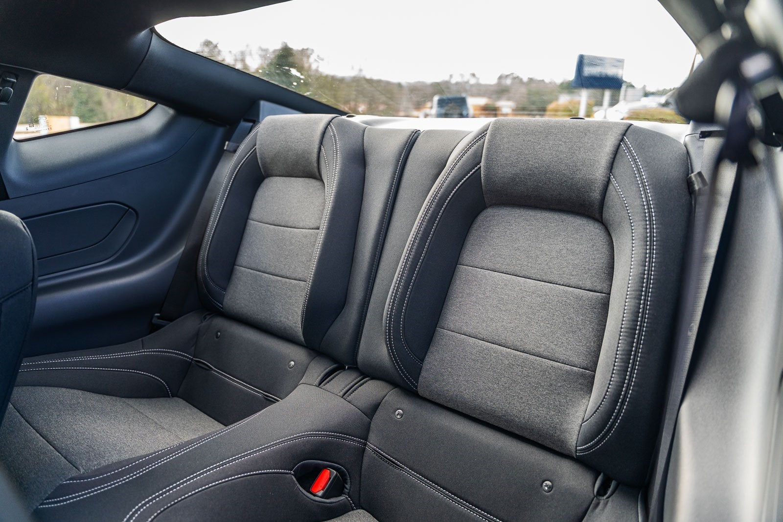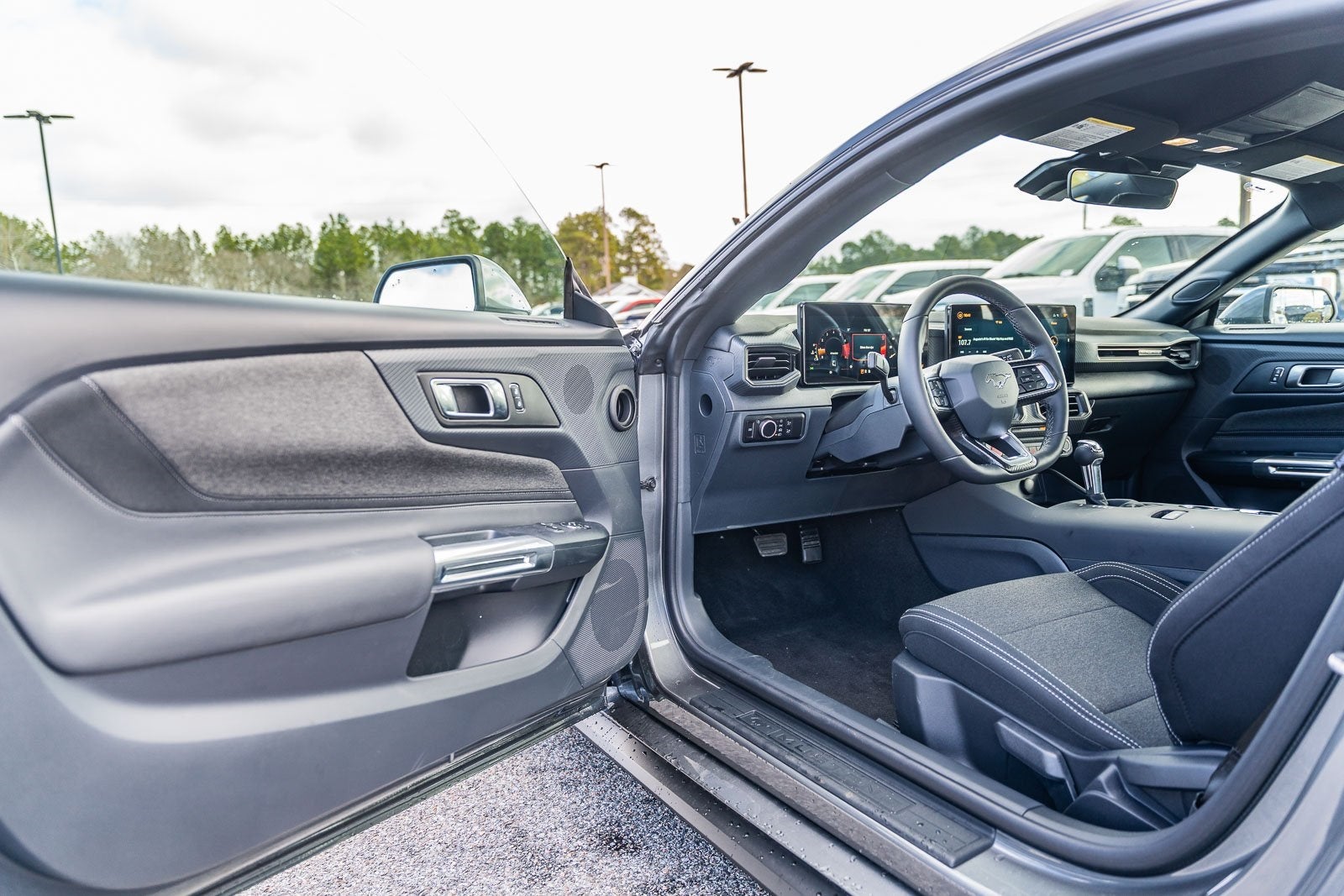 This vehicle comes equipped with 1st Row Carpeted Black Floor Mats, 4-Wheel Disc Brakes, ABS brakes, Air Conditioning, Alloy wheels, AM/FM Stereo, Auto High-beam Headlights, Automatic temperature control, Brake assist, Bumpers: body-color, Compass, Delay-off headlights, Driver door bin, Driver vanity mirror, Dual front impact airbags, Dual front side impact airbags, Electronic Stability Control, Emergency communication system: 911 Assist, Exterior Parking Camera Rear, Four wheel independent suspension, Front anti-roll bar, Front Bucket Seats, Front Center Armrest, Front dual zone A/C, Front reading lights, Fully automatic headlights, Illuminated entry, Knee airbag, Leather Shift Knob, Low tire pressure warning, Occupant sensing airbag, Outside temperature display, Overhead airbag, Overhead console, Panic alarm, Passenger door bin, Passenger vanity mirror, Power door mirrors, Power steering, Power windows, Radio data system, Rain sensing wipers, Rear anti-roll bar, Rear Parking Sensors, Rear window defroster, Remote keyless entry, Speed control, Speed-sensing steering, Speed-Sensitive Wipers, Split folding rear seat, Sport steering wheel, Steering wheel mounted audio controls, SYNC 4, Tachometer, Telescoping steering wheel, Tilt steering wheel, Traction control, Trip computer, Variably intermittent wipers, Voltmeter, and Wheels: 18 x 8 Painted Shadow Silver Cast Aluminum.