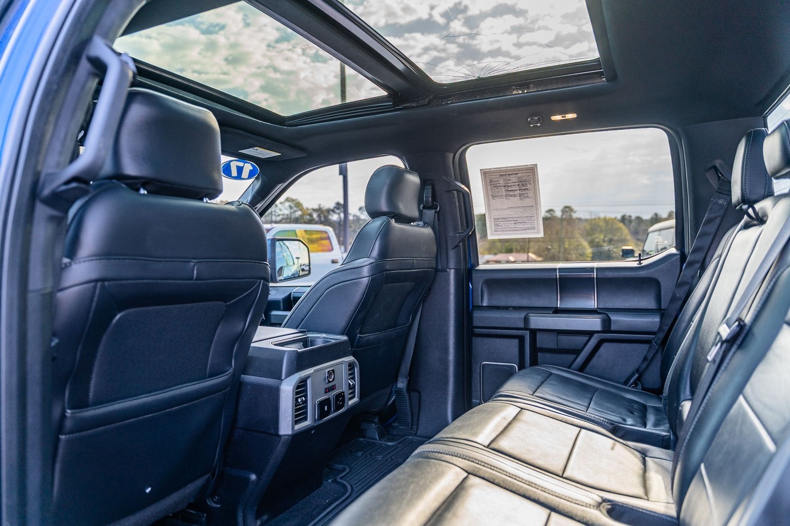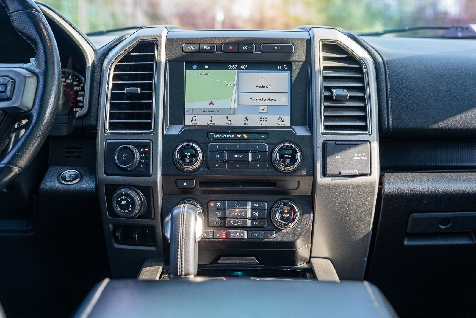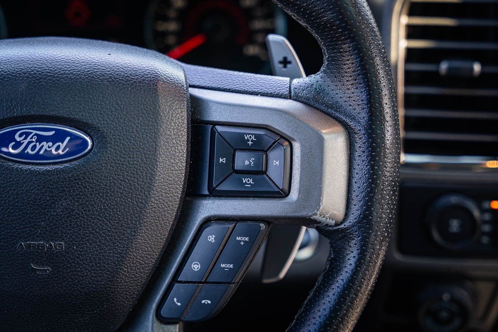 This vehicle comes equipped with Equipment Group 802A Luxury (10-Way Power Driver & Passenger Seats, 360 Degree Camera, 4.10 Front Axle w/Torsen Differential, Advanced Security Pack, Ambient Lighting, BLIS Blind Spot Information System, Dual-Zone Electronic Automatic Temperature Control, Inflatable Rear Safety Belts, Integrated Trailer Brake Controller, Intelligent Access w/Push-Button Start, LED Box Lighting, LED Side-Mirror Spotlights, Memory System (Seat, Pedal, Exterior Mirror), Power Glass Heated Sideview Mirrors, Power Tilt/Telescoping Steering Column w/Memory, Power-Adjustable Pedals, Power-Sliding Rear Window, Pro Trailer Backup Assist, Radio: Sony Single CD w/HD & SiriusXM Satellite, Remote Start System w/Remote Tailgate Release, SYNC 3, SYNC Connect, Universal Garage Door Opener, and Voice-Activated Navigation), Exterior Graphics Package, Hood Graphics Package, Raptor Technology Package (Adaptive Cruise Control w/Collision Mitigation, Auto High Beam, and Lane-Keeping System), 4WD, 17 Cast Aluminum Wheels, 4-Wheel Disc Brakes, 7 Speakers, 8-Way Power Driver's Seat w/Power Lumbar, ABS brakes, Air Conditioning, Alloy wheels, AM/FM radio: SiriusXM, Auto-dimming Rear-View mirror, Brake assist, CD player, Compass, Delay-off headlights, Driver door bin, Driver vanity mirror, Dual front impact airbags, Dual front side impact airbags, Electronic Locking w/4.10 Axle Ratio, Electronic Stability Control, Exterior Parking Camera Rear, Front anti-roll bar, Front Bucket Seats, Front Center Armrest, Front fog lights, Front reading lights, Front wheel independent suspension, Fully automatic headlights, Heated Leather 40/Console/40 Front Seats, Illuminated entry, Leather steering wheel, Low tire pressure warning, Occupant sensing airbag, Outside temperature display, Overhead airbag, Overhead console, Panic alarm, Passenger door bin, Passenger vanity mirror, Power door mirrors, Power driver seat, Power steering, Power windows, Radio data system, Rear Parking Sensors, Rear reading lights, Rear step bumper, Rear window defroster, Remote keyless entry, Security system, Speed control, Speed-sensing steering, Split folding rear seat, Steering wheel mounted audio controls, SYNC, Tachometer, Tailgate Applique, Tailgate Step w/Tailgate Lift Assist, Telescoping steering wheel, Tilt steering wheel, Traction control, Trip computer, Twin Panel Moonroof, Unique Cloth/Leather Trim Seats, and Variably intermittent wipers.