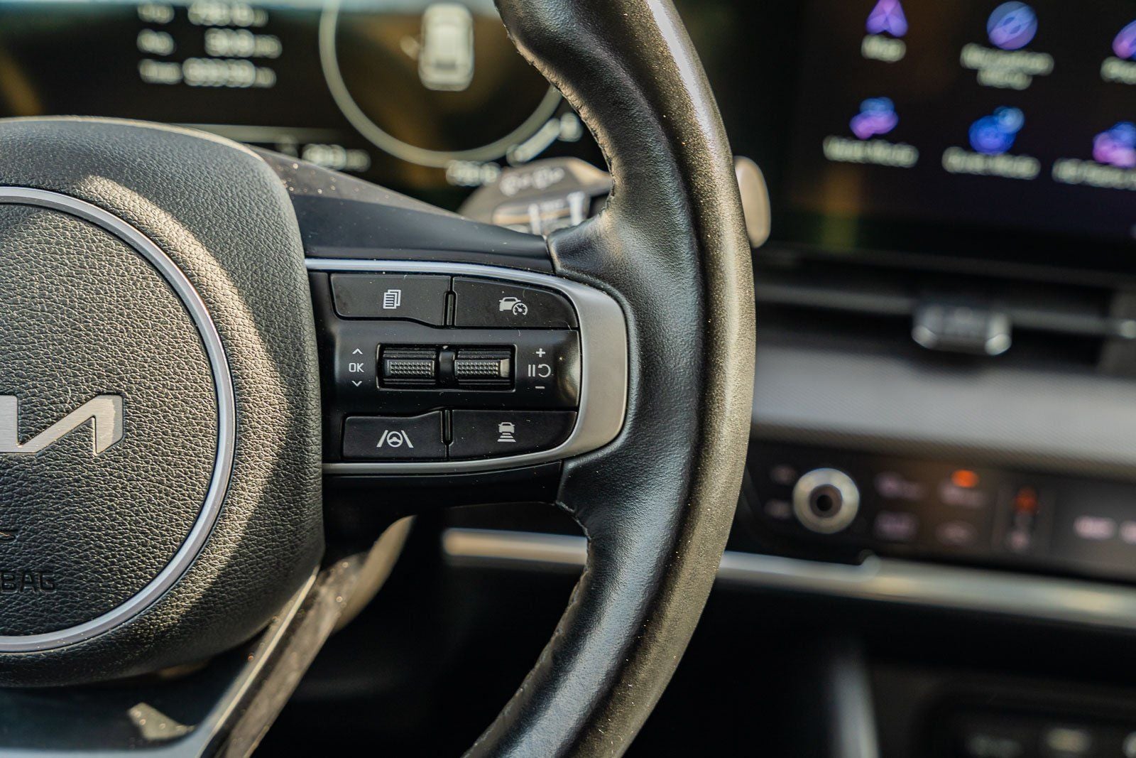 This vehicle comes equipped with Kia Certified, 4-Wheel Disc Brakes, 8 Speakers, ABS brakes, Air Conditioning, Alloy wheels, AM/FM radio: SiriusXM, Apple CarPlay & Android Auto, Auto High-beam Headlights, Auto-dimming Rear-View mirror, Automatic temperature control, Axle Ratio: 3.648, Brake assist, Bumpers: body-color, Carpeted Floor Mats, Compass, Delay-off headlights, Driver door bin, Driver vanity mirror, Dual front impact airbags, Dual front side impact airbags, Electronic Stability Control, Emergency communication system, Four wheel independent suspension, Front anti-roll bar, Front Bucket Seats, Front Center Armrest, Front dual zone A/C, Front fog lights, Front reading lights, Fully automatic headlights, Garage door transmitter: HomeLink, harman/kardon® Speakers, Heated & Ventilated Front Bucket Seats, Heated door mirrors, Heated front seats, Heated steering wheel, Illuminated entry, Leather Shift Knob, Leather steering wheel, Low tire pressure warning, Memory seat, Navigation System, Occupant sensing airbag, Outside temperature display, Overhead airbag, Overhead console, Panic alarm, Passenger door bin, Passenger vanity mirror, Power door mirrors, Power driver seat, Power Liftgate, Power moonroof, Power passenger seat, Power steering, Power windows, Premium Leatherette Seat Trim, Radio: AM/FM/HD Audio System, Rain sensing wipers, Rear anti-roll bar, Rear reading lights, Rear seat center armrest, Rear window defroster, Rear window wiper, Remote keyless entry, Security system, Speed control, Speed-sensing steering, Split folding rear seat, Spoiler, Steering wheel mounted audio controls, Tachometer, Telescoping steering wheel, Tilt steering wheel, Traction control, Trip computer, Turn signal indicator mirrors, Variably intermittent wipers, Ventilated front seats, and Wheels: 19 Gloss Black Alloy.
